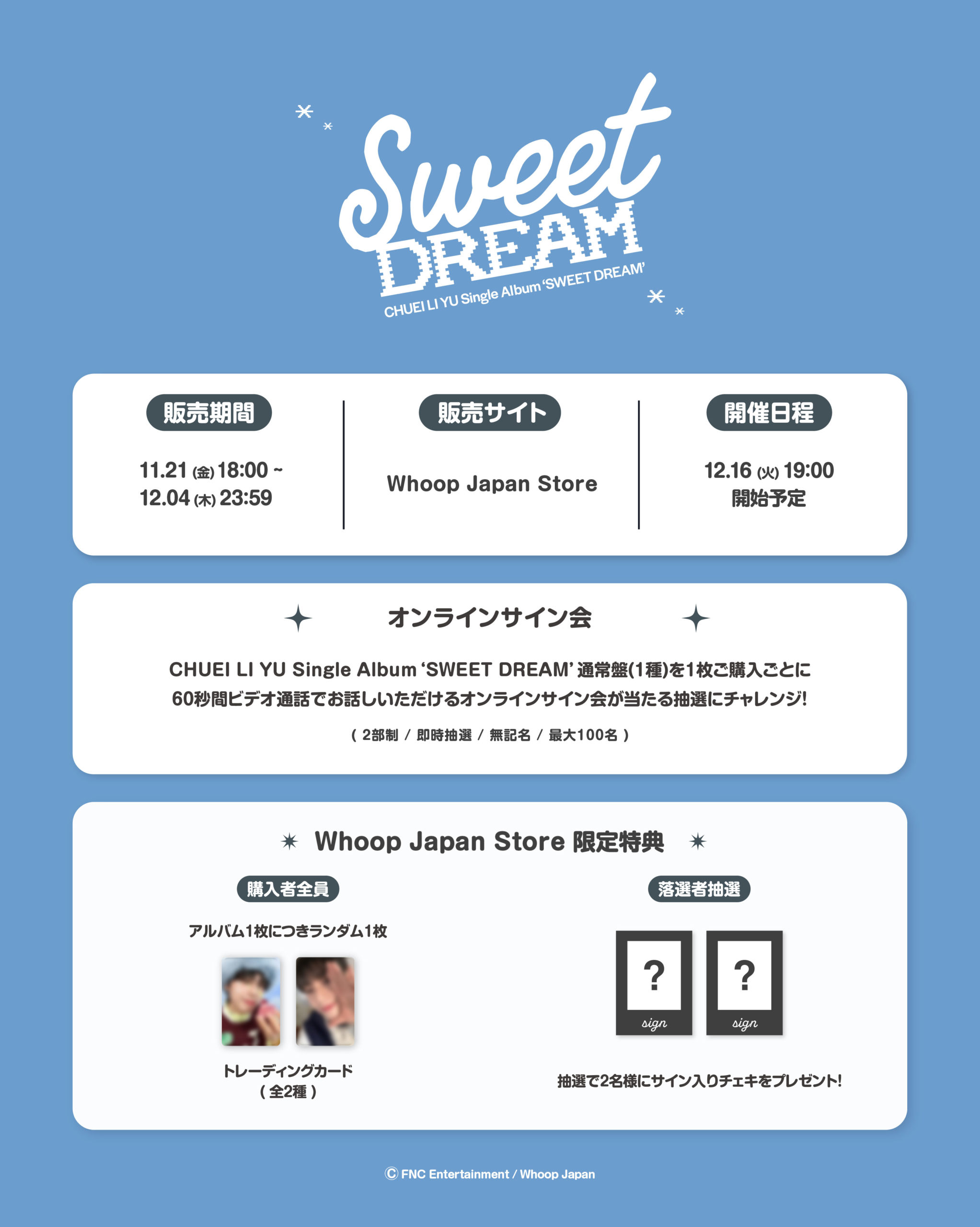 Whoop Japan Storeにて、CHUEI LI YU Single Album ‘SWEET DREAM’ 通常盤(1種) を1枚ご購入ごとに、抽選に1回ご参加いただけます! 当選された方は、CHUEI LI YUと1:1で60秒間ビデオ通話でお話しいただけるオンラインサイン会にご参加いただけます。(抽選/無記名)