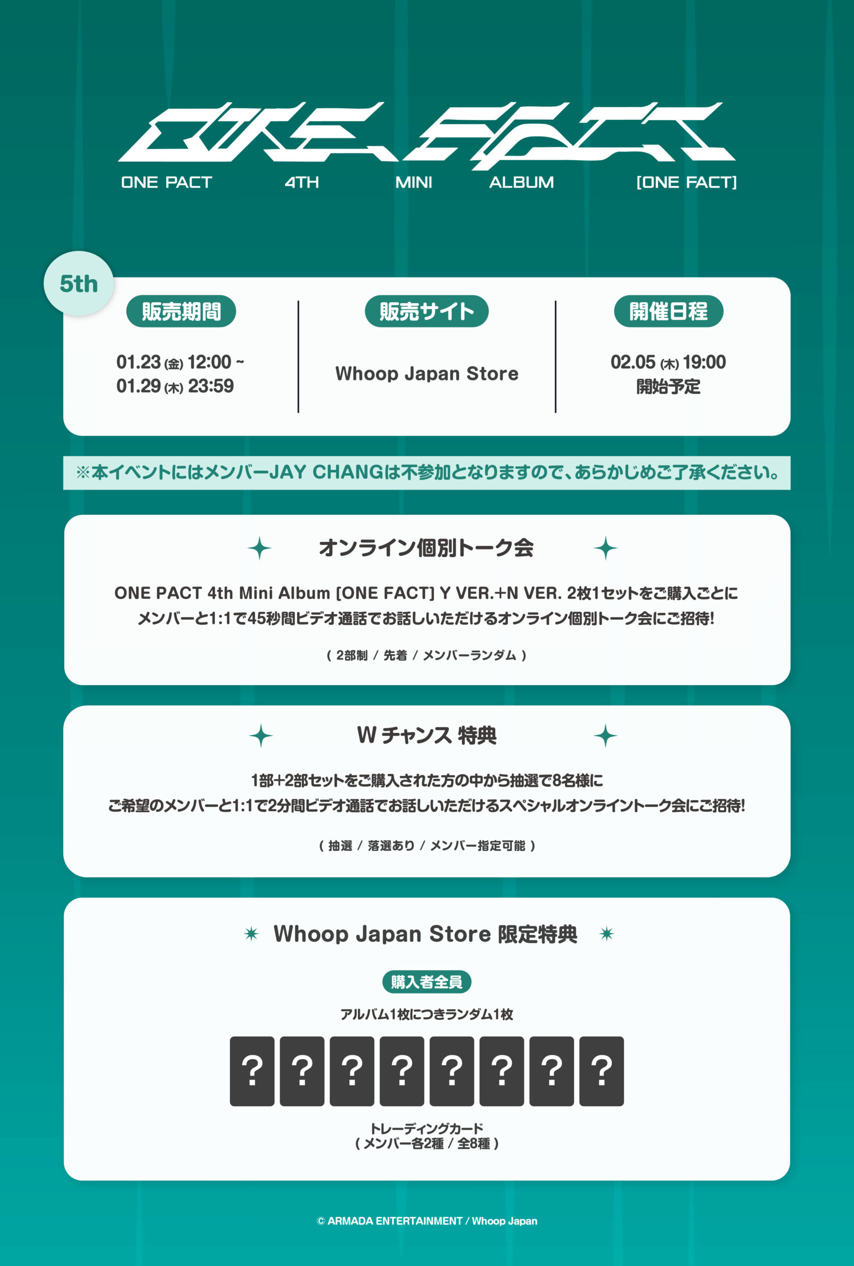 Whoop Japan Storeにて、ONE PACT 4th Mini Album [ONE FACT] Y VER.+N VER. を2枚1セットご購入ごとに、メンバーと1:1で45秒間ビデオ通話でお話しできるオンライン個別トーク会に1回ご参加いただけます。(先着/メンバーランダム)