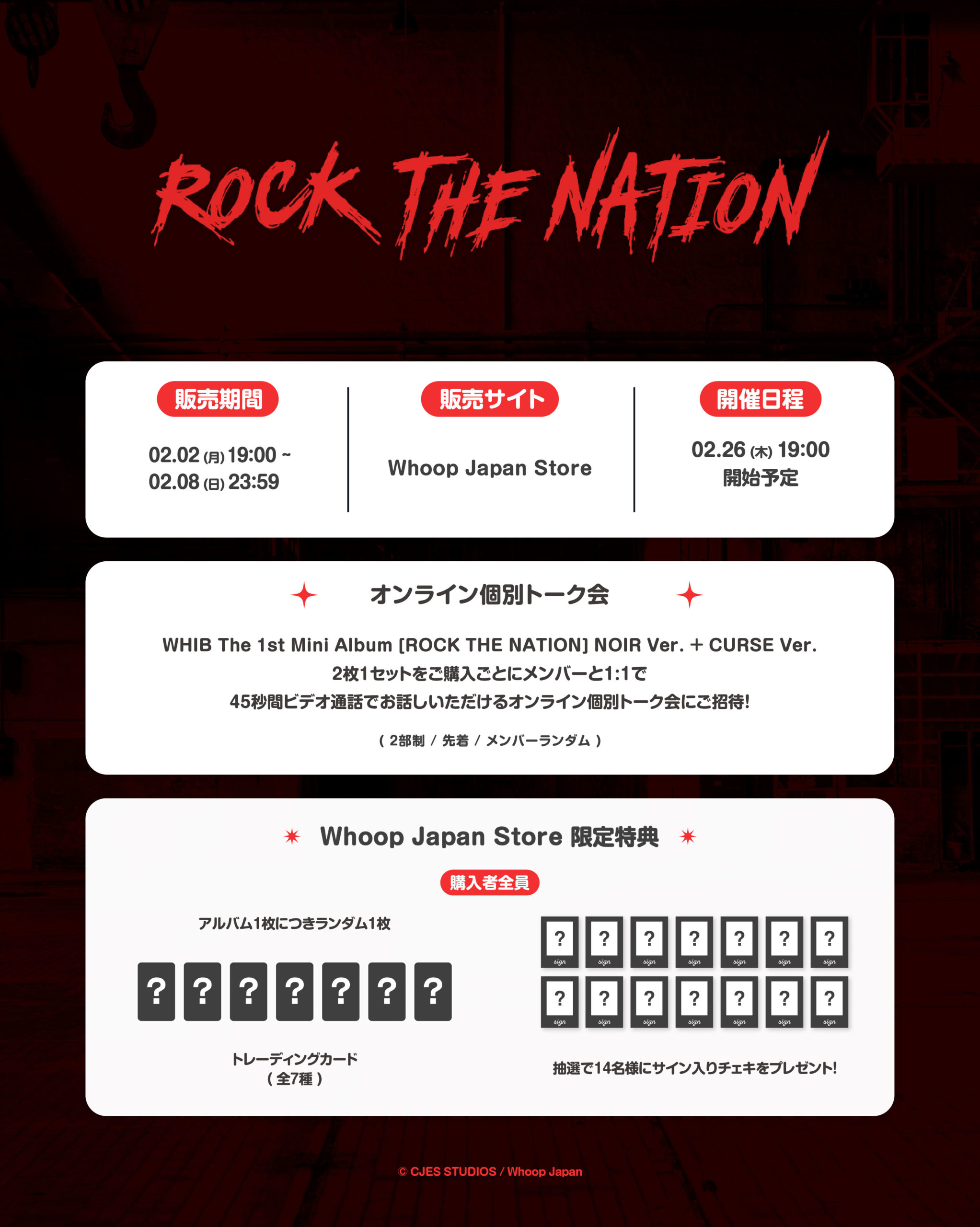 Whoop Japan Storeにて、WHIB The 1st Mini Album [ROCK THE NATION] NOIR Ver.+CURSE Ver.を2枚1セットご購入ごとに、メンバーと1:1で45秒間ビデオ通話でお話しできるオンライン個別トーク会に1回ご参加いただけます。(先着/メンバーランダム)