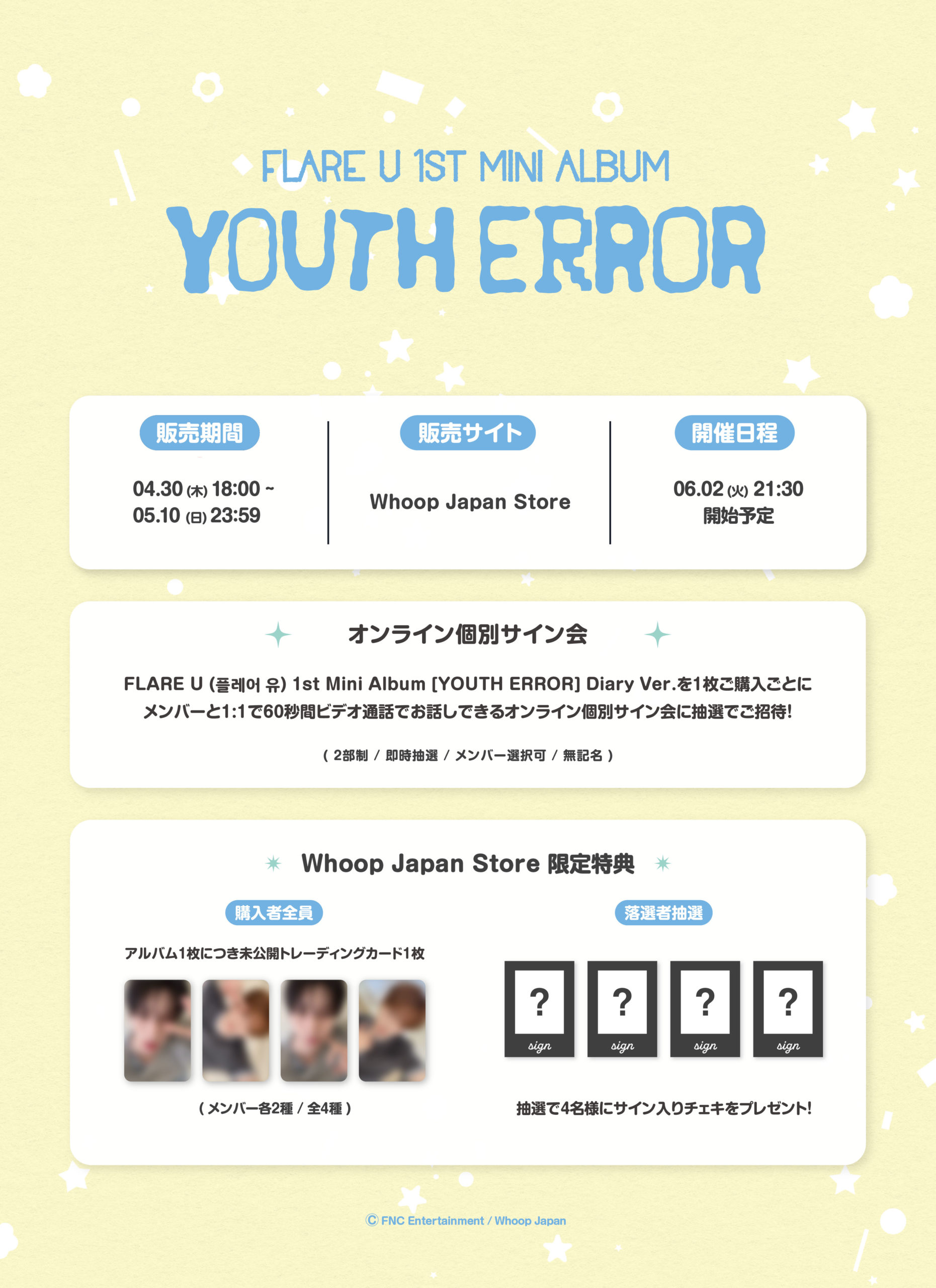 Whoop Japan Storeにて、FLARE U (플레어 유) 1st Mini Album [YOUTH ERROR] Diary Ver. を1枚ご購入ごとに、メンバーと1:1で60 秒間ビデオ通話でお話しできるオンライン個別サイン会に抽選でご参加いただけます。(即時抽選/メンバー選択可/無記名)